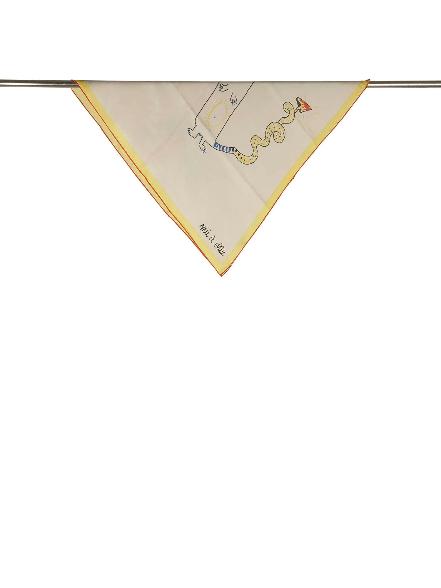 Foulard carré Mii con motivi colorati surrealisti stampati a mano all over realizzati dall'artista Bérengère Henin e suo marito Anthony Peskine; il tema rappresentato è il "cadavre exquis", che in italiano significa "cadavere squisito", un gioco collettivo surrealista nato nel 1925 a Parigi, ideato da artisti come André Breton e Yves Tanguy. Consiste nel creare frasi o disegni collaborativi in sequenza, dove ogni partecipante aggiunge un elemento senza vedere il contributo precedente. Il risultato è un'opera spesso bizzarra e inaspettata, che riflette l'interesse surrealista per l'inconscio e la spontaneità. Profili gialli (09A/CHAT SURREALISTE).